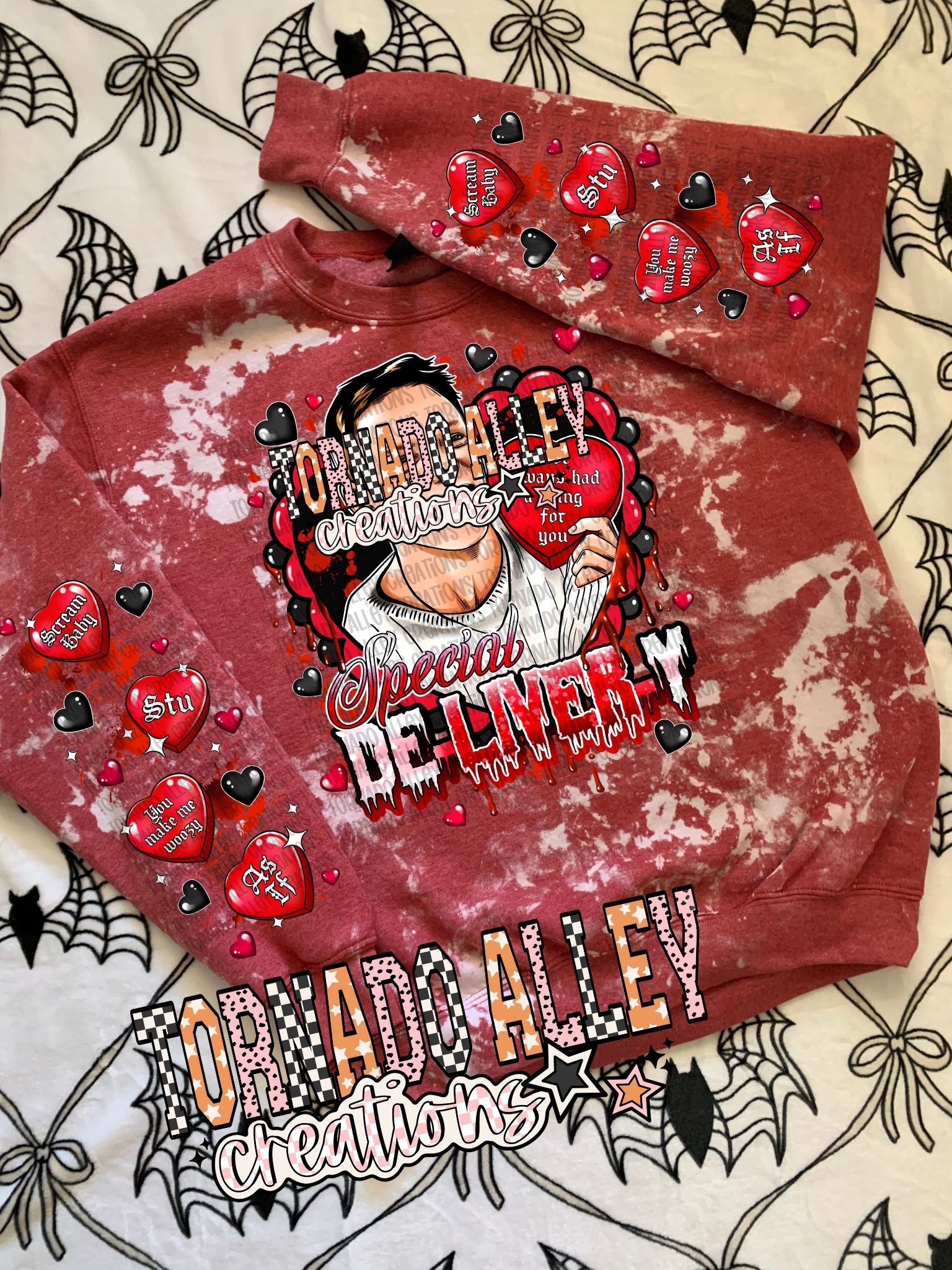 Red Heather Bleached Unisex Poly/Cotton Crewneck with a DTF transfer.