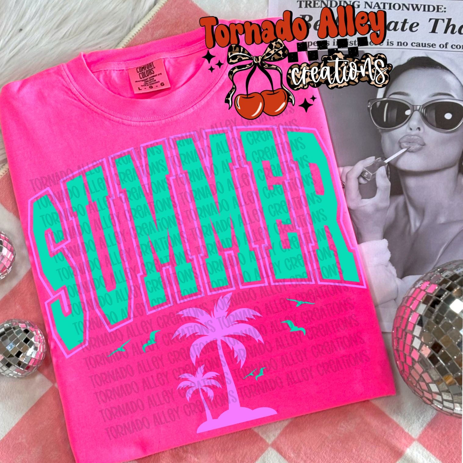 Neon Pink Cotton Comfort Colors Tee with DTF transfer.